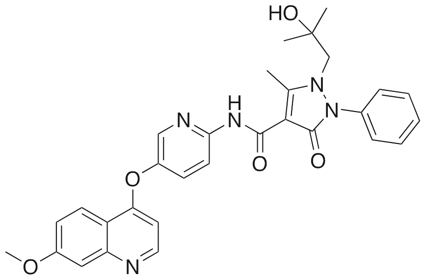 AMG-458 is an inhibitor of c-MET that exhibits anticancer chemotherapeutic activity. AMG-458 enhances the radiosensitivity of lung adenocarcinoma cells, decreasing activation of Akt and ERK and inducing apoptosis. In vivo, this compound inhibits the growth of glioblastoma tumors.
