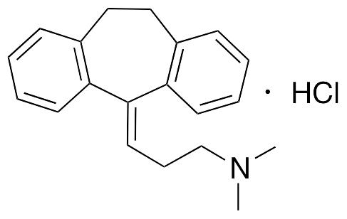 Amitriptyline exhibits antidepressant, antipsychotic, analgesic, and antinociceptive activities; it acts as an antagonist at 5-HT2A/2C/6/7 receptors, M1-5 muscarinic acetylcholine receptors (mAChRs), H1/4 histamine receptors, α1-adrenergic receptors, and also on the serotonin transporter (SERT) and norepinephrine transporter (NET). Additionally, amitriptyline acts as an agonist at σ1 receptors and TrkA/B receptors. Amitriptyline inhibits shaker-related Kv1.1 (KCNA1), Kv7.2 (KCNQ2), and Kv7.3 (KCNQ3) voltage-gated K+ channels and L-type voltage-gated Ca2+ channels; it inhibits expression of Nav1.1 (SCN1A) and Nav1.2 (SCN2A) voltage-gated Na+ channels and activates ryanodine RyR2 receptors. Amitriptyline also decreases levels of α1-adrenergic receptors in the cortex and cerebellum in vivo. In animal models of chronic constrictive injury and neuropathic pain, amitriptyline decreases thermal hyperanalgesia. In PC12 neurons, this compound exhibits neuroprotective activity, increasing neurite outgrowth and decreasing cell death. Amitriptylene is also a function inhibitor of acid sphingomyelinase (FIASMA).