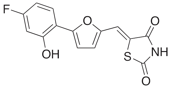 AS-252424 is an inhibitor of p110γ PI3K that exhibits anti-inflammatory activity. In animal models of peritoneal inflammation, AS-252424 decreases leukocyte recruitment. In vascular smooth muscle cells, AS-252424 decreases endothelin A receptor-mediated activity of transient receptor potential canonical 1/5/6 channels (TRPC1/5/6) and potentiates related activity of TRPC3/7 channels.