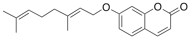 Auraptene is a monoterpene coumarin originally found in Citrus species. Auraptene exhibits anti-inflammatory, neuroprotective, anti-parasitic, antihypertensive, anti-diabetic, and chemopreventive activities. Auraptene inhibits growth of species of Leishmania, decreases mean arterial pressure, binds estrogen receptors, inhibits ACAT, and induces phase II metabolizing enzymes. Auraptene also inhibits LPS-induced COX-2 expression, loss of body weight, activation of microglia and astrocytes, and brain inflammation in animal models of cerebral ischemia. Additionally, auraptene activates PPARα, improving high fat diet-induced hyperglycemia and alterations in glucose tolerance. This compound also decreases expression of cyclin D1 and delays tumor formation in animal models of mammary carcinogenesis.