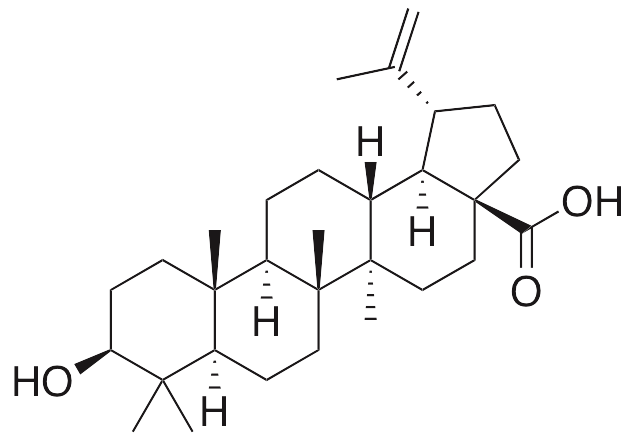 Betulinic acid is a pentacyclic triterpene that exhibits antithrombotic, anti-atherosclerotic, antioxidative, anti-inflammatory, anti-angiogenic, and anticancer chemotherapeutic properties. Betulinic acid decreases expression of P-selectin and binding of PAC-1, preventing platelet aggregation. In macrophages, betulinic acid inhibits phosphorylation of IκB and p65 and prevents activation of NF-κB, promoting cholesterol efflux and decreasing cellular levels of cholesterol; in vivo, this leads to a decrease in atherosclerotic lesion size. In rat aortic tissue, betulinic acid induced relaxation through preventing increases in ROS, decreases in NO, and decreases in eNOS and superoxide dismutase (SOD) activity induced by superoxide anions. In animal models, this compound increases activity of superoxide dismutase (SOD), glutathione peroxidase, and glutathione reductase and also decreases expression of cyclooxygenase (COX-2), NO, TNF-α, and IL-1β, resulting in a decrease in paw edema. In adenocarcinoma cells, this betulinic acid inhibits collagen biosynthesis, decreases prolidase activity, and decreases expression of HIF-1α, VEGF, and α1/2 integrins. Betulinic acid decreases expression of cyclin D3 and Bcl-xl in vitro, inducing cell cycle arrest and apoptosis. Additionally, this compound downregulates expression of Sp1 protein, decreasing lung tumor growth in animal models.