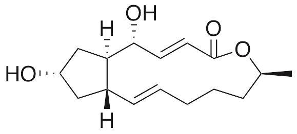 Brefeldin A is a lactone antibiotic found in fungi such as Eupenicillium; it exhibits anticancer and antiviral activities. Brefeldin A inhibits activity of guanine nucleotide exchange factors, preventing association with COPI and COPI-mediated vesicle formation and suppressing protein transport from the endoplasmic reticulum to the Golgi apparatus. Brefeldin A is used in research models to study endoplasmic reticulum stress and protein transport. In vitro, this compound inhibits poliovirus replication. In prostate cancer cells, brefeldin A inhibits cell growth, induces apoptosis and G1 phase cell cycle arrest, decreases levels of p53, CDK2, CDK4, and cyclin D1, and causes cell death.