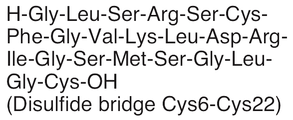 C-type natriuretic peptide (CNP) is a natriuretic peptide (NP) that binds NP-B receptors. This peptide exhibits cardioprotective and anti-inflammatory activities. In animal models, CNP increases conduction velocity in the sinoatrial node and decreases infarct size in models of ischemia/reperfusion. In vitro, CNP decreases basal ATP-sensitive K+ channel openings and currents. Animal models of mutant CNP display arthritis, cartilage damage, and growth delay, highlighting roles for CNP in the regulation of skeletal growth and inflammation. CNP binding NP receptors increases cGMP levels and opens cystic fibrosis transmembrane receptor (CTFR) Cl- channels in a PDE3/cAMP/PKA-dependent manner.
