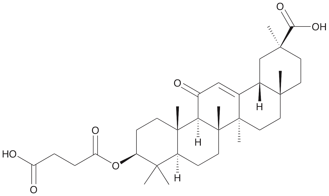 Carbenoxolone is a synthetic derivative of the active component of licorice (Glycyrrhiza glabra) and is most well known for its ability to inhibit gap junction connexin channels and 11β-hydroxysteroid dehydrogenase. Carbenoxolone displays a wide variety of beneficial properties, including neuroprotective, anti-inflammatory, and anti-obesity activities. In animal models, carbenoxolone decreases stroke infarction size and neuronal damage after middle cerebral artery occlusion and also delays the onset of experimental autoimmune encephalitis (EAE), potentially by decreasing production of IL-23 and Th17 cells. Carbenoxolone also prevents atrial inflammation and atrial fibrillation by inhibiting macrophage migration into atria. This compound exudes several benefits in obese mice, inhibiting expression of sterol regulatory element binding protein 1c (SREBP1C) and preventing development of fatty liver disease. In vitro, carbenoxolone inhibits expression of pro-inflammatory cytokines and apoptotic proteins; it also prevents fatty acid-induced expression of ROS and reverses fatty acid-induced mitochondrial membrane depolarization. In high-fed diet mice, this compound decreases expression of GLUT4, PPAR-γ, and other lipid-regulating genes, resulting in decreased body weight and visceral fat mass and increased sensitivity to insulin.