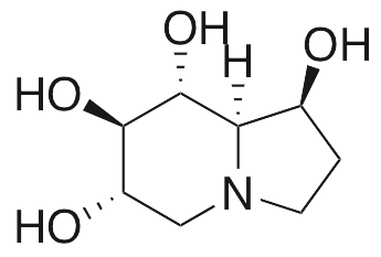 Castanospermine acts as an inhibitor of N-glycosylation, inhibiting O-GlcNAcase, resulting in immunosuppressive, anti-inflammatory, and antiviral activities. In leukocytes and endothelial cells, castanospermine decreases expression of cellular adhesion molecules ICAM-1, ICAM-2, L-selectin, LFA-1α, VLA-4, Mac-1, and CR4. Castanospermine inhibits metastasis of melanoma cells through a mechanism that involved initial tumor cell arrest. In other cellular models, castanospermine increases secretion of misfolded secretory protein α1 antitrypsin Z. In animal models of arthritis, castanospermine decreases release of inflammatory markers into the synovium, preventing the development of arthritis when given as a pre-treatment and inhibiting disease progression when given after onset. Alteration of glycoprotein processing also inhibits viral replication of the Moloney murine leukemia virus.
