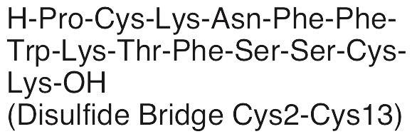 Cortistatin-14 is an endogenous neuropeptide related to somatostatin that binds and activates somatostatin and ghrelin receptors, inhibiting secretion of growth hormone and insulin. Cortistatin-14 exhibits anticonvulsant/antiepileptic, anti-inflammatory, and antinociceptive activities. In animal models, cortistatin-14 decreases seizure duration. In macrophages, this peptide inhibits production of IL-1β. Similarly, cortistatin-14 decreases capsaicin-induced release of CGRP in rat trachea and suppresses carrageenan-induced edema in other animal models.