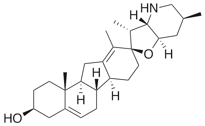 Cyclopamine is a steroidal jerveratrum alkaloid found in Veratrum that binds Smo, inhibiting hedgehog (Shh) signaling pathways. Cyclopamine exhibits anticancer activity, decreases expression of Gli2 and Bcl-2, inhibiting proliferation and inducing apoptosis in adenoma cells and neuroblastoma cells.
