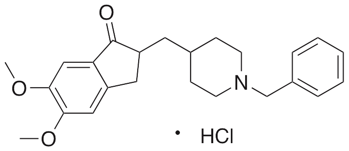 Donepezil is an acetylcholinesterase (AChE) inhibitor that is clinically used to treat Alzheimer’s disease. Donepezil displays neuroprotective, cognition enhancing, cardioprotective, and anti-inflammatory activities. In animal models, donepezil improves memory and learning ability. In vitro, donepezil downregulates expression of the NR1 subunit of NMDA receptors, inhibiting glutamate-mediated Ca2+ entry into cells; this mechanism is thought to be dependent on donepezil activity on α7 nicotinic acetylcholine receptors (nAChRs). Additionally, this compound inhibits glycogen synthase kinase 3 (GSK3) and activates PI3K/Akt signaling, helping to prevent amyloid-β (Aβ) toxicity. Donepezil also binds to σ1 receptors. In animal models of congestive heart failure, donepezil decreases left ventricular end diastolic pressure, increases left ventricular contractility, decreases left ventricular expression of brain natriuretic peptide (BNP), and decreases heart weight, resulting in greater survival rates.