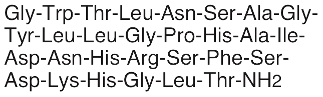 Galanin is an endogenous neuropeptide that binds GAL receptors and is involved in action potential signaling and propagation in neurons. Galanin exhibits anticonvulsant/antiepileptic activity, inhibiting glutamate and suppressing seizures. Galanin also inhibits insulin secretion and plays a role in nociception, sleep regulation, cognition, feeding, blood pressure, and mood. Galanin displays both neuroprotective and neurotoxic activities, as galanin expression is increased in the brain tissue of Alzheimer’s disease patients; it is also involved in modulation of cholinergic signaling.