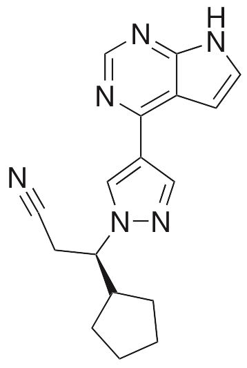 INCB018424 is an inhibitor of JAK1/2 that is clinically used to treat rheumatoid arthritis and myelofibrosis. INCB018424 exhibits anticancer, anti-inflammatory, and antiviral activities. In myeloma cells, INCB018424 inhibits cell growth. INCB018424 also inhibits in vitro infection by HIV-1, HIV-2, and SHIV by preventing viral replication in lymphocytes. In animal models of CCL4-induced hepatic injury, INCB018424 prevents inflammation by decreasing neutrophil and macrophage infiltration, suppressing activation of NF-κB, and limiting release of TNF-α, IL-10, and IL-1β.