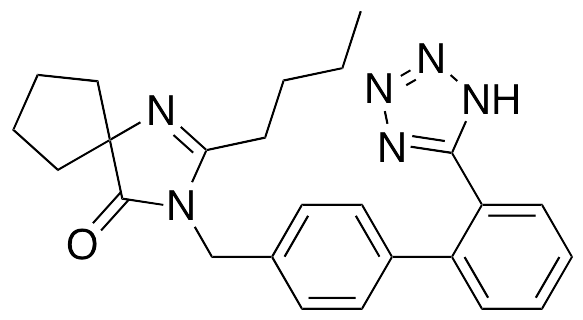 Irbesartan is an angiotensin II type 1 (AT1) receptor inhibitor that also activates PPARγ receptors; it exhibits antihypertensive, cardioprotective, and anti-hyperlipidemic activities. In angiotensin-converting enzyme 2 (ACE2)-deficient mice, irbesartan decreases TGF-β1, atrial natriuretic factor, collagen, and phospho-ERK1/2 expression and increases PPARγ expression, reversing cardiac hypertrophy and myocardial fibrosis. In animal models of angiotensin II (ATII)-mediated abdominal aortic aneurysm, irbesartan prevents macrophage infiltration, pro-inflammatory cytokine release, smooth muscle attenuation, and medial elastolysis, and also limits aneurysm enlargement. In obese hypertensive rats, this compound decreases plasma levels of free fatty acids, triglycerides, and insulin; it also upregulates expression of hepatic PPARα. In high fat diet rats, irbesartan decreases body weight and adipose tissue weight and improves glucose metabolism and vascular function.