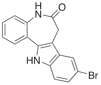 Kenpaullone is an inhibitor of GSK-3β, HGK, and CDKs that exhibits anti-inflammatory, immunomodulatory, and neuroprotective activities. Kenpaullone increases levels of SREBP-1 as well as GIRK-4 and acetylcholine-activated inwardly rectifying K+ (IKACh) channels in diabetic mice. Kenpaullone also inhibits TGF-β-induced induction of RORγt and increases expression of Foxp3 in T cells, inhibiting pathology of experimental autoimmune encephalitis (EAE) in vivo. In pluripotent stem cells derived from autotrophic lateral sclerosis (ALS) patients, kenpaullone improves motor neuron survival. Additionally, this compound inhibits MPP+-induced cell death in cellular models of Parkinson’s disease by preventing changes in the mitochondrial membrane potential and inhibiting activation of caspases.