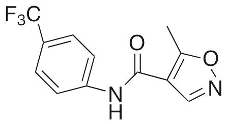 Leflunomide inhibits dihydroorotate dehydrogenase, preventing UMP formation and pyrimidine synthesis. Metabolites of leflunomide may inhibit various kinases such as JNK and JAK. Leflunomide is clinically used to treat rheumatoid arthritis; it exhibits immunosuppressive, antiviral, and anticancer activities. In several cellular models, leflunomide prevents apoptosis and increases viability in human cytomegalovirus (CMV)-infected cells and inhibits replication of polyomavirus BK. Additionally, leflunomide increases activity of aryl hydrocarbon receptors, inhibiting proliferation of melanoma cells.