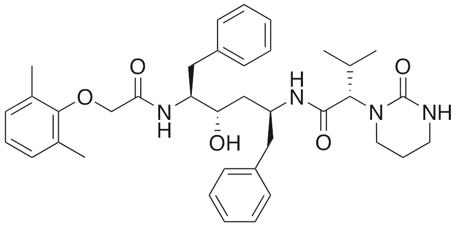 Lopinavir is an HIV protease inhibitor that displays antiviral and anticancer activities. In vitro, lopinavir inhibits sarco/endoplasmic reticulum Ca2+-ATPase (SERCA), decreasing intracellular Ca2+ levels. In vivo, lopinavir’s inhibition of SERCA induces endoplasmic reticulum stress. In human papilloma virus (HPV)-positive cervical cancer cells, lopinavir upregulates ribonuclease L protein (RNASEL), potentially inducing cell death. In meningioma cells, lopinavir induces cell cycle arrest and inhibits cell growth.