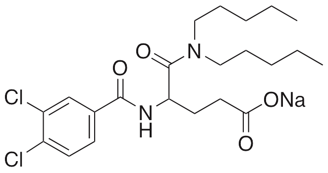 Lorglumide is an antagonist at cholestocystokinin (CCK) receptors; it exhibits antacid, anti-ulcerative, gastrointestinal motility modulating, and anticancer activities. Lorglumide decreases gastrointestinal motility and gastric secretion and is clinically used to treat ulcers, irritable bowel syndrome, constipation, and dyspepsia. Lorglumide also inhibits proliferation of colon cancer cells.