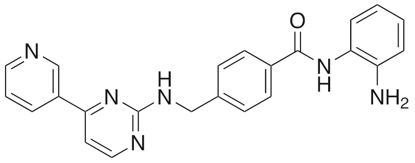MGCD-0103 (Mocetinostat) is a benzamide histone deacetylase (HDAC) inhibitor that exhibits anticancer chemotherapeutic, anti-fibrotic, antihypertensive, and cardiomodulatory activities. MGCD-0103 is currently in clinical trials as a potential treatment for several leukemias and lymphomas. In sham hearts, MGCD-0103 improves left ventricular and end diastolic pressure and decreases total collagen levels; in CD90+ cells, it decreases levels of collagen III, matrix metalloproteinase 2, and α-SMA. In other models, MGCD-0103 increases natriuretic peptide receptor (NPR1) promoter activity, increasing transcription of guanyl cyclase A/natriuretic peptide receptor A. MGCD-0103 also decreases pulmonary artery pressure, right ventricular hypertrophy, and vascular remodeling in animal models of myocardial infarction and heart failure. Additionally, this compound induces apoptosis, activates PI3K/Akt/mTOR signaling, and decreases autophagy in chronic lymphocytic leukemia (CLL) cells.