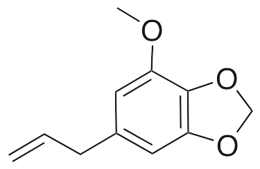 Myristicin is an allylbenzene found in spices and umbelliferous plants. Myristicin exhibits anticancer, anti-inflammatory, and antibiotic activities. In leukemia cells, myristicin decreases the mitochondrial membrane potential and increases cytochrome c release and activation of caspase 3 and PARP, inducing apoptosis. In alveolar epithelial cells, myristicin decreases IL-1β-induced production of IL-6. Myristicin also exhibits antibacterial and antifungal efficacy against Clostridium, Enterococcus, Candida, Eubacterium, and Peptostreptococcus. At high doses, myristicin may be neurotoxic.