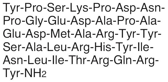 Neuropeptide Y (NPY) is an endogenous peptide neurotransmitter that exhibits a variety of properties, including vasoconstrictive/hypertensive, neuromodulatory, cognition enhancing, reward and reinforcement-modulating, antidepressant, anxiolytic, pro-angiogenic, and pro-atherosclerotic activities. NPY is produced by sympathetic nervous system neurons and activates Y receptors. In vivo, NPY potentiates reward- and reinforcement-inducing effects of opioids in operant behavior assays. In other animal models, NPY inhibits amyloid-β (Aβ)-induced depression and spatial memory deficits in the tail suspension and object location tasks. NPY also decreases or prevents stress-induced development of anxiety during the forced swim test and elevated plus maze models. Additionally, NPY promotes vascular growth and may play a role in the development of atherosclerosis.