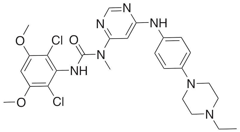 NVP-BGJ398 is an inhibitor of FGFR that exhibits anticancer chemotherapeutic and antirachitic activities. NVP-BGJ398 inhibits cell viability in colon cancer cells and prevents progression and tumor formation in animal models of malignant rhabdoid tumors. In endometrial cancer cells, NVP-BGJ398 induces cell cycle arrest and inhibits growth; in vivo, it also inhibits tumor growth. NVP-BGJ398 inhibits aberrant FGFR signaling in animal models of rickets disease, normalizing bone growth and mineralization.