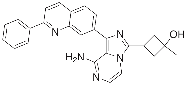 OSI-906 (Linsitinib) inhibits IGF-1R and InsR, displaying anticancer chemotherapeutic activity; it is currently in clinical trials as a potential treatment for colorectal cancer. In animal models of ovarian cancer, OSI-906 inhibits tumor development and growth. This compound also decreases tumor growth in animal models of fibroblast tumors. OSI-906 inhibits cell proliferation in colorectal cancer, breast cancer, pancreatic cancer, and non-small cell lung cancer (NSCLC) cells.