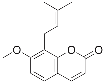 Osthole is an O-methylated coumarin that inhibits Ca2+ channels. It exhibits anticancer, antioxidative, anti-inflammatory, and cardioprotective activities. In glioblastoma cells, osthole inhibits IGF-1-induced epithelial-to-mesenchymal transition (EMT), decreases phosphorylation of Akt and GSK-3β, inhibiting cell migration. Osthole also exhibits anti-metastatic potential in lung cancer cells, inhibiting migration and invasion by decreasing expression of matrix metalloproteinases 2 and 9 (MMP2/9). In animal models of ischemia/reperfusion, osthole decreases levels of ROS, malondialdehyde, IL-6, TNF-α, and myeloperoxidase, increases activity of superoxide dismutase, and improves lung injury pathology. Osthole also inhibits lung inflammation induced by administration of carrageenan in vivo. In animal models of cardiac ischemia/reperfusion, this compound inhibits lipid peroxidation and decreases expression of HMGB1 and NF-κB.