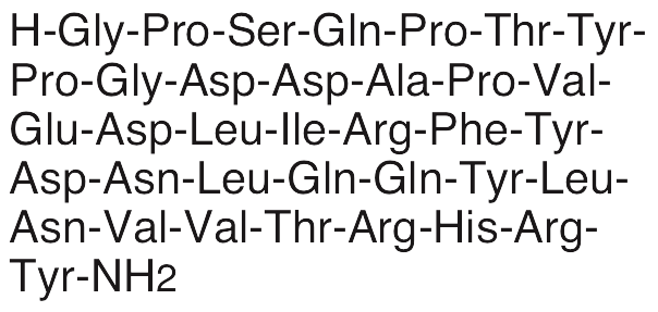 Pancreatic polypeptide is an endogenous neuropeptide Y-family hormone that exhibits anorexigenic activity. Pancreatic polypeptide binds the Y4 receptor to decrease food intake, increase locomotor activity, and stimulate colonic muscle contractions and transit. Decreased secretion of pancreatic polypeptide is associated with improvements in pancreatic β-cell function in subjects with type 2 diabetes.