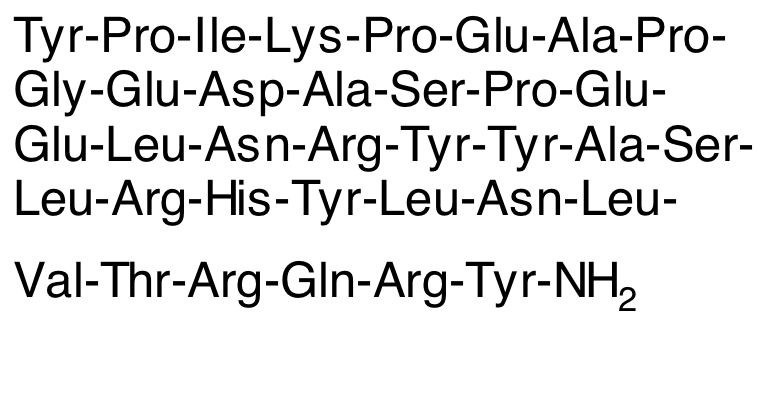 Peptide YY is an endogenous neuropeptide Y-related peptide that activates Y1 and Y2 receptors. Peptide YY is an appetite-regulating hormone secreted from the gastrointestinal tract that exhibits anorexigenic and gastrointestinal motility modulating activities. Peptide YY decreases osteoblast activity, contributing to bone loss in clinical settings in which patients have recently lost weight. Peptide YY also decreases levels of AMPK and phosphorylated acetyl CoA carboxylase in the liver, decreasing lipid oxidation and/or increasing lipogenesis. Peptide YY also induces slight improvements in insulin response during glucose challenge in animal models. In other in vivo models, peptide YY induces mucosal anti-secretory activity, inhibiting colonic and upper gastrointestinal transit.