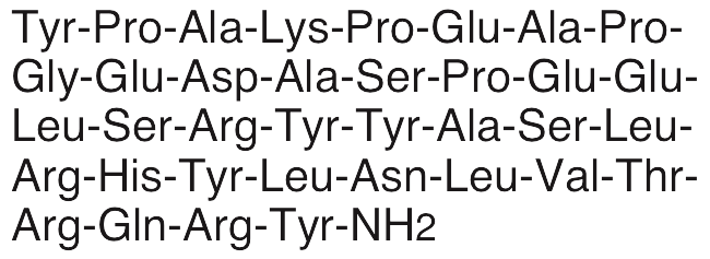Peptide YY is an endogenous neuropeptide Y-related peptide that activates Y1 and Y2 receptors. Peptide YY is an appetite-regulating hormone secreted from the gastrointestinal tract that exhibits anorexigenic and gastrointestinal motility modulating activities. Peptide YY decreases osteoblast activity, contributing to bone loss in clinical settings in which patients have recently lost weight. Peptide YY also decreases levels of AMPK and phosphorylated acetyl CoA carboxylase in the liver, decreasing lipid oxidation and/or increasing lipogenesis. Peptide YY also induces slight improvements in insulin response during glucose challenge in animal models. In other in vivo models, peptide YY induces mucosal anti-secretory activity, inhibiting colonic and upper gastrointestinal transit.