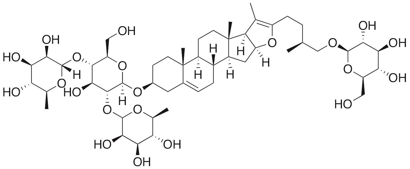 Pseudoprotodioscin is a steroidal saponin originally found in species of Tribulus, Trigonella, and Smilax. Pseudoprotodioscin exhibits anti-inflammatory and anticancer activities. This compound inhibits melanogenesis in melanoma cells and inhibits production of inflammatory cytokines such as TNF-α in THP-1 cells. Pseudoprotodioscin displays mild cytotoxicity across several cancer cell lines.