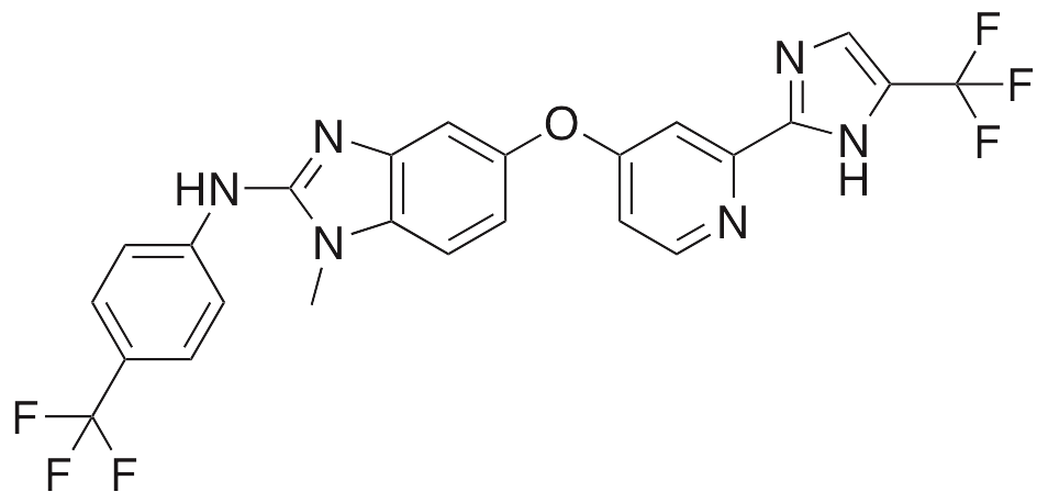 RAF265 is an orally bioavailable anticancer chemotherapeutic compound that inhibits primarily WT B-Raf, mutant (V600E) B-Raf, and VEGFR2, but is also active against c-Raf, PDGFR, CSF-1R, RET, c-Kit, Src, and STE20. This compound is in clinical trials as a treatment for unresectable or metastatic melanoma. Inhibition of B-Raf by RAF265 attenuates downstream ERK and RET signaling, preventing tumor cell proliferation. Raf265-induced alterations in ERK signaling also decreases expression of c-fos and NFATc1, inhibiting in vitro differentiation of PBMCs to osteoclasts and inhibiting osteoclast resorptive capacity, therefore inhibiting osteoclastogenesis.