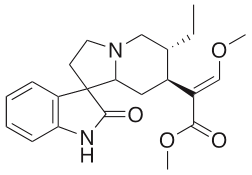 Rhynchophylline is an oxyindole alkaloid found in Uncaria sinensis. Rhynchophylline displays anti-arrhythmic, antithrombotic, antioxidative, and neuroprotective characteristics. This compound inhibits platelet aggregation, decreases channel activation and peak tail currents of voltage-gated hERG K+ channels on myocytes, and decreases Ca2+ currents of L-type Ca2+ channels. Additionally, rhynchophylline noncompetitively inhibits NMDA receptors and downregulates expression of the NR2B NMDA receptor subunit. As a result of these mechanisms, rhynchophylline protects against glutamate-induced neuronal death and acts as a vasodilator. This compound also decreases presence of superoxide anions and inhibits NF-κB activation through actions on IκB kinase, preventing epileptic seizures in vivo.