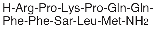 Substance P (SP) is an endogenous tachykinin neuropeptide that is involved in inflammatory, pain, and stress signaling; it exhibits neuroprotective, cognition enhancing, and gastrointestinal motility modulating activities. SP exhibits neuroprotective activity by decreasing expression of Kv1.4 K+ channels in transgenic animal models of Alzheimer’s disease and improving cognitive performance in the Morris water maze task. SP is the natural ligand for the neurokinin-1 (NK1) receptor. In various animal models, SP modulates opioid signaling, induces gastric mucosal protection, and inhibits retinal apoptosis. SP also prevents hyperoxia-induced lung damage, decreasing levels of malondialdehyde and increasing levels of superoxide dismutase (SOD); this activity may be regulated through SHH signaling. In melanoma cells, SP decreases levels of tyrosinase and melanin, inhibiting melanogenesis. In other cellular models, SP increases the viability and proliferation of osteoblasts and promotes gap junction intracellular communication.