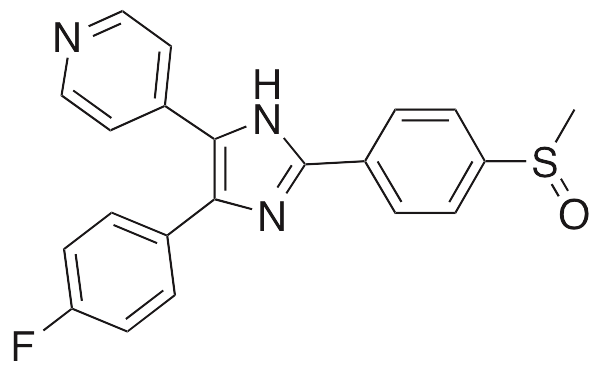 SB-203580 is an inhibitor of p38 MAPK that exhibits immunostimulatory, anticancer, and anti-fibrotic activities. In peripheral blood mononuclear cells, SB-203580 increases secretion of IFN-γ. In lung epithelial cells, SB-203580 inhibits TGF-β1-induced epithelial-to-mesenchymal transition (EMT). Additionally, SB-203580 inhibits proliferation in glioma cells and decreases angiotensin II- and TGF-β1-induced expression of GTGF and fibronectin in other cellular models.