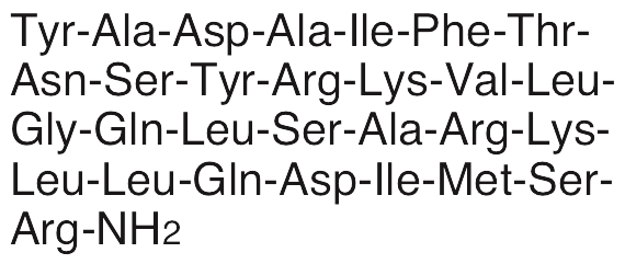 Sermorelin is a synthetic 28-amino acid peptide analog of growth hormone-releasing hormone (GHRH). Sermorelin exhibits immunomodulatory and pro-angiogenic activities. In vivo, sermorelin stimulates secretion of growth hormone from the pituitary gland; it also increases IGF-1 secretion and increases the number of activated immune cells in circulation. Sermorelin induces histamine release from mast cells in a Ca2+-dependent manner. Additionally, this peptide increases secretion of VEGF and chromogranin A, increasing proliferation in neuroendocrine tumor cells.