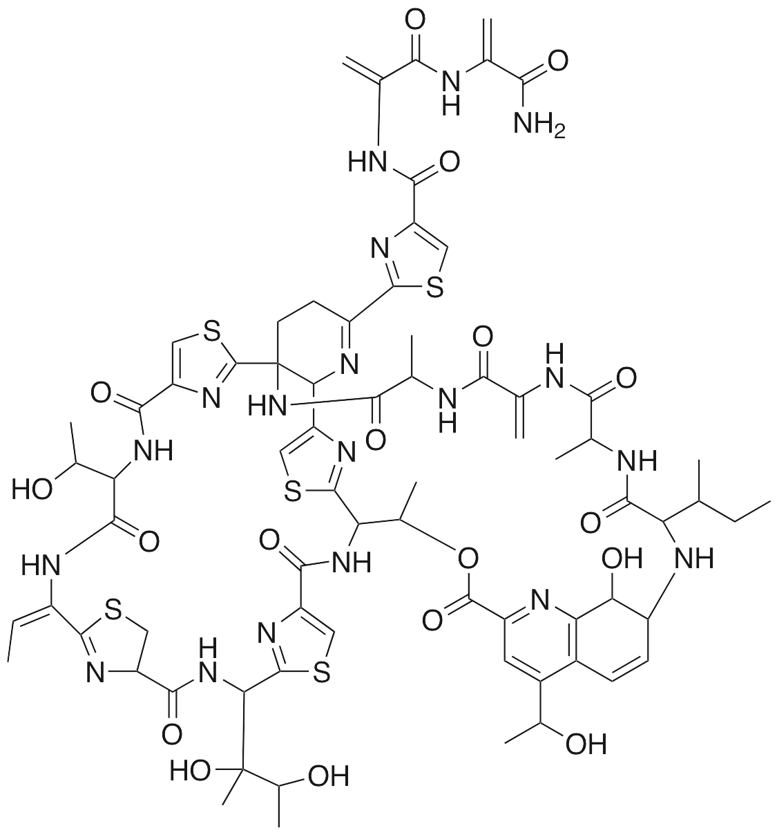 Thiostrepton is a thiazole antibiotic that exhibits antibacterial and anticancer properties. Thiostrepton inhibits the proteasome, binding 23s rRNA; it inhibits phosphate release after GTP hydrolysis in the ribosome, preventing tRNA translocation and turnover and inhibiting elongation during protein synthesis. Thiostrepton also inhibits the expression of Forkhead box M1 (FOXM1), an oncogenic transcription factor involved in cell cycle progression and oxidative stress responses. This compound alters the electrophoretic mobility of peroxiredoxin 3 (PRX3), disabling mitochondrial antioxidative activities during oxidative stress.
