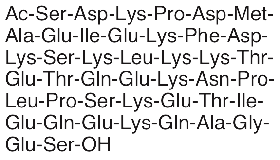 Thymosin β-4 is an endogenous pro-angiogenic, fibroblast-activating peptide that is involved in hormone regulation. Thymosin β-4 also exhibits immunomodulatory and cardioprotective activities. Thymosin β-4 improves would healing in cardiac issue and improves cardiac function in vivo. Thymosin β-4 binds G-actin filaments, preventing actin polymerization.