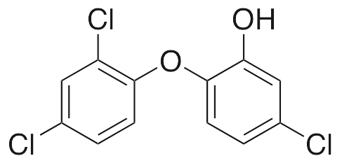Triclosan is a diarylether antimicrobial often found in commercial soap products. Triclosan exhibits antibacterial, antifungal, antiviral, and anti-inflammatory activities. Triclosan binds bacterial enoyl-acer carrier protein reductase (ENR), increasing its affinity for NAD+ and forming a complex that prevents fatty acid synthesis and bacterial cell membrane formation. Triclosan also inhibits LPS-induced pro-inflammatory responses in epithelial cells.